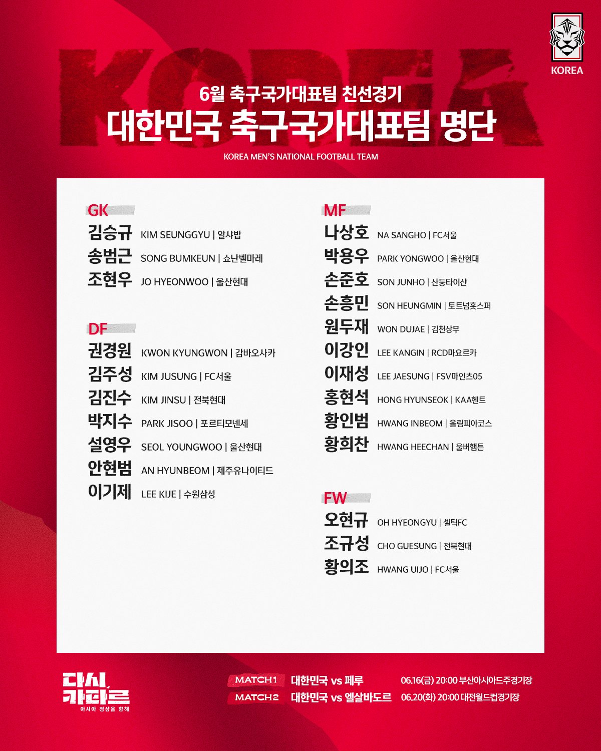 수비라인은 김민재(나폴리) 김영권(울산 현대) 조유민(대전하나시티즌)에 이어 권경원(감바오사카)까지 빠졌습니다. 3월 A매치에 나선 센터백이 모두 제외되는데 월드클래스 수비스 철기둥 김민재는 군사훈련으로 이번 경기에 불참합니다.