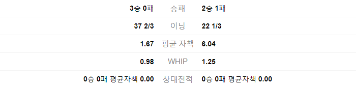 쿠에바스는 0승 0패를 기록중이며, 4 2/3 이닝을 던졌습니다. 평균 자책은 5.79 입니다. 황동하은 0승 0패를 기록 중이며, 10 1/3 이닝을 던졌습니다. 평균자책은 1.74 입니다.