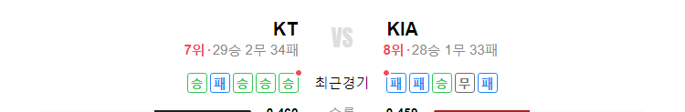 KT는 29승2무34패로 현재 7위이며, KIA은 28승1무33패로 현재 8위입니다. KT는 최근 5경기에서 4승 1패를 기록 중이며, KIA은 최근 5경기에서 1승 1무 3패를 기록 중입니다.