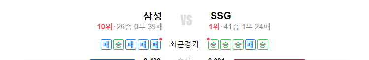 삼성는 26승0무39패로 현재 10위이며, SSG은 41승1무24패로 현재 1위입니다. 삼성는 최근 5경기에서 1승 4패를 기록 중이며, SSG은 최근 5경기에서 4승 1패를 기록 중입니다.