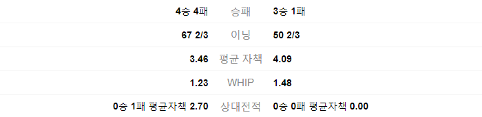 백정현는 4승 4패를 기록중이며, 67 2/3 이닝을 던졌습니다. 평균 자책은 3.46 입니다. 김광현은 3승 1패를 기록 중이며, 50 2/3 이닝을 던졌습니다. 평균자책은 4.09 입니다.