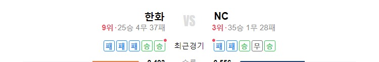 한화는 25승4무37패로 현재 9위이며, NC은 35승1무28패로 현재 3위입니다. 한화는 최근 5경기에서 2승 3패를 기록 중이며, NC은 최근 5경기에서 2승 1무 2패를 기록 중입니다.