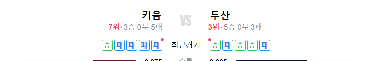 키움는 3승0무5패로 현재 7위이며, 두산은 5승0무3패로 현재 3위입니다. 키움는 최근 5경기에서 1승 4패를 기록 중이며, 두산은 최근 5경기에서 3승 2패를 기록 중입니다.