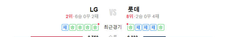 LG는 6승0무2패로 현재 2위이며, 롯데은 2승0무4패로 현재 8위입니다. LG는 최근 5경기에서 4승 1패를 기록 중이며, 롯데은 최근 5경기에서 2승 3패를 기록 중입니다.