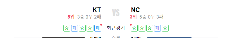 KT는 3승0무2패로 현재 5위이며, NC은 5승0무3패로 현재 3위입니다. KT는 최근 5경기에서 3승 2패를 기록 중이며, NC은 최근 5경기에서 4승 1패를 기록 중입니다.